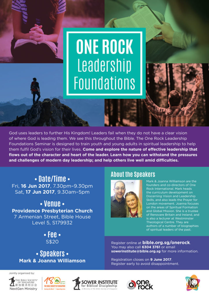 God uses leaders to further His Kingdom! Leaders fail when they do not have a clear vision of where God is leading them. We see this throughout the Bible. The One Rock Leadership Foundations Seminar is designed to train prospective youth and young adult leaders in spiritual leadership to help them fulfil God’s vision for their lives. Come and explore the nature of effective leadership that flows out of the character and heart of the leader. Learn how you can withstand the pressures and challenges of modern day leadership and help others live well amid difficulties.